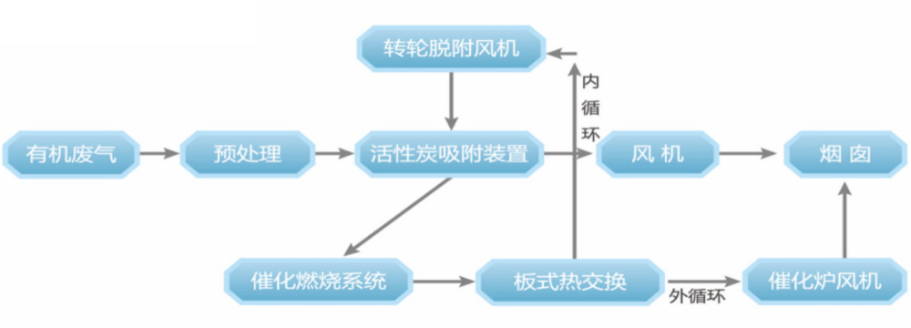 The organic gas adsorption catalytic purification device is suitable for the treatment of low and medium concentration organic waste gas. System principle: mainly according to the adsorption performance of porous activated carbon and the desorption performance of activated carbon at high temperature, the organics are respectively adsorbed and desorbed. The desorbed organics enter the catalytic combustion furnace at 300-400 ℃ for catalytic combustion to oxidize C and H compounds into CO2 and H2O, etc.